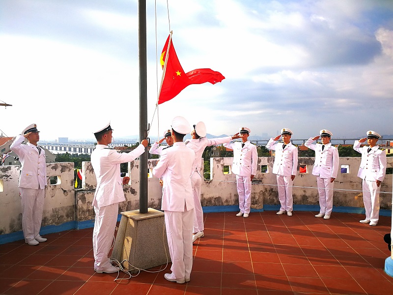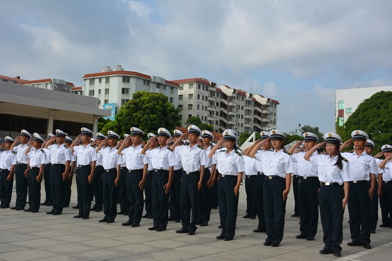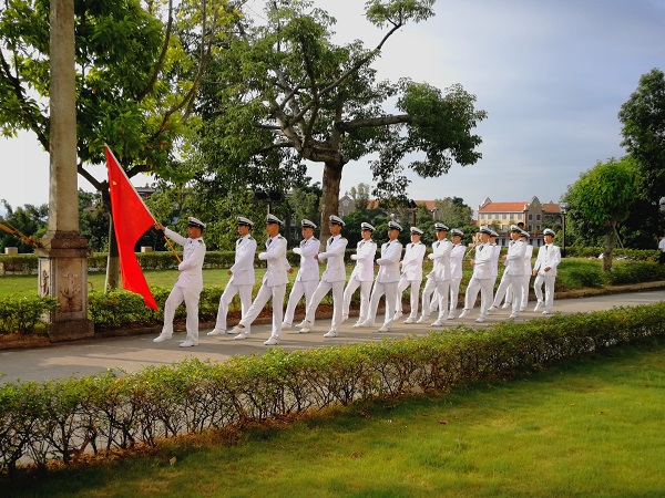 晨光熹微的校园,航海学院允恭楼前陆陆续续聚集了自发前来参加升旗仪式的同学们,国旗护卫队的同学早早开始彩排,他们想用最标准的姿势和最美的姿态表达对祖国母亲的生日祝福。