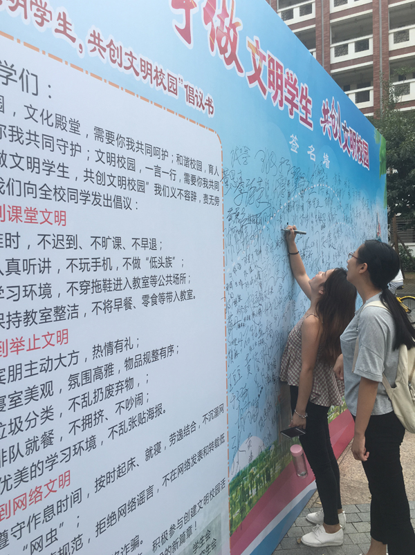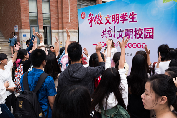 活动现场,同学们踊跃参与文明校园迎评知识竞答活动,在轻松愉快的氛围中加深了对社会主义核心价值观、校史校训、文明礼仪等大学生应知应会内容的理解和认同;校学生会、研究生会和自律会等学生组织,向全校学生发出“争做文明学生,共创文明校园”倡议,广大学生踊跃响应并在“签名墙”上纷纷留言,表达了积极参与文明校园创建的热情。在航海学院、轮机工程学院和财经学院等校区,也都开展了文明倡议、美化校园、主题班会等活动。
