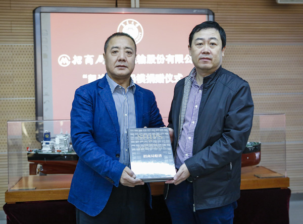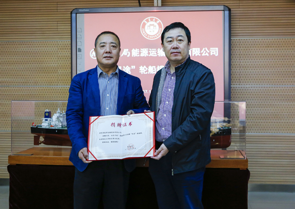 招商局能源运输股份有限公司向我校捐赠了“凯途”轮船模和招商局船谱,于洪亮向刘威武颁发了捐赠证书。