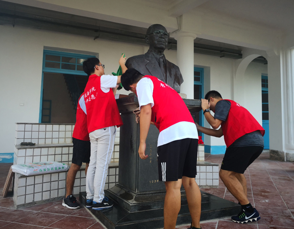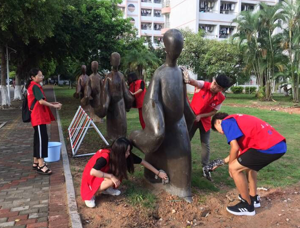 活动期间,志愿者们按照分工和计划,有条不紊、耐心细致地擦洗雕塑上和基座上的尘土,清除基座四周的杂草,使校园里的雕塑焕然一新。
