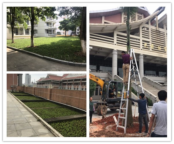 早在今年年初,资产与后勤管理处便开始为迎接校庆做好日常绿化养护工作:安排丹田物业大面积的进行乔、灌木、草皮等的施肥工作,促进校园植物能够枝繁叶茂;从暑假开始安排物业进行有规律的修剪,让校园内植物以最好的状态迎接百年校庆。到8月底,资产与后勤管理处已完成了美岭楼、建发楼200多平的屋顶绿化;对行道树进行补植和更换,补植了71株全冠香樟,填补因莫兰蒂台风造成学校行道树的严重缺损,并在关键地点补植乔、灌木5000余株;还对老校区,如航海学院行道树进行了修剪。目前,正在对全校的裸露地面进行草皮补植,对厦门市政园林局赠送我校的780株三角梅控水控花,提升改造人工湖与老校区的绿化工程。