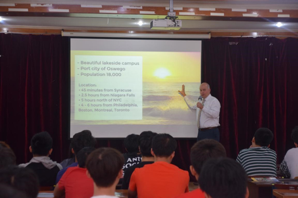 会谈结束后,Joshua McKeown还为教育部留学服务中心我校战略合作伙伴项目2018级新生做了关于留学美国纽约州立大学奥斯威戈校区的讲座。讲座中,他从学校办学环境、专业和奖学金设置、社团活动等方面介绍了留学纽约州立大学奥斯威戈校区的美好前景和突出优势,并耐心回答了同学们提出的相关问题。