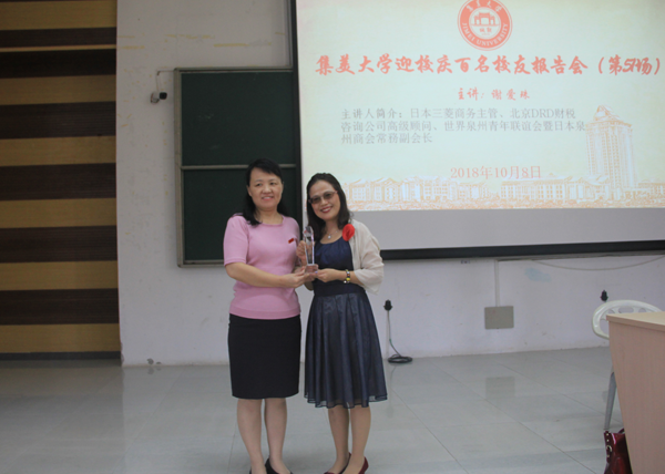 报告会后,外国语学院有关领导为谢爱珠颁发了迎校庆百名校友报告会主讲嘉宾牌匾。