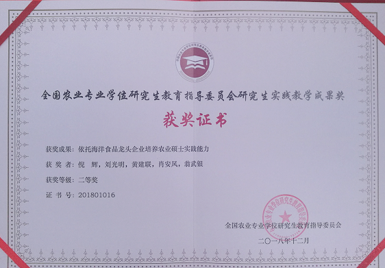 近日,全国农业专业学位研究生教育指导委员会(以下简称“教指委”)秘书处公布了全国农业硕士专业学位研究生实践教学成果奖获奖名单,我校食品与生物工程学院“依托海洋食品龙头企业培养农业硕士实践能力”成果获二等奖。
