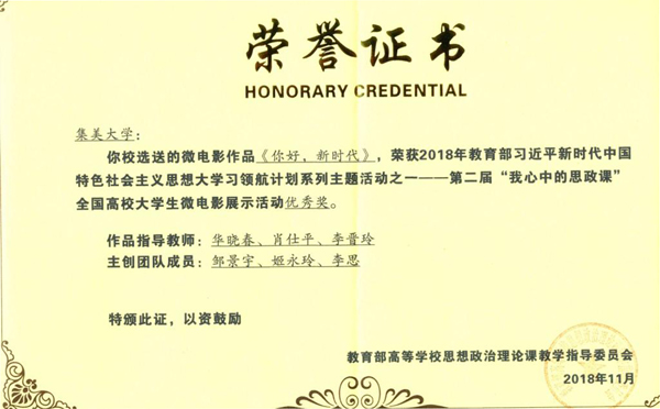 近日,由教育部高校思想政治理论课教学指导委员会主办的第二届“我心中的思政课”全国高校大学生微电影展示活动评选结果揭晓,我校马克思主义学院研究生邹景宇、姬永玲、李思主创的微电影《你好,新时代》荣获优秀奖。