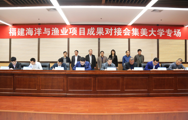 福建省海洋与渔业局征集了福建省企业技术需求,我校发动校内各科研平台及机构等提出合作项目、科技成果和意向性合作单位,共促成福建金荣达水产发展有限公司、福建天马科技集团股份有限公司、福建省万利鸿海珍品有限公司等企业代表在会上与我校食品与生物工程学院、水产学院、轮机工程学院等签约,共签约16个项目。