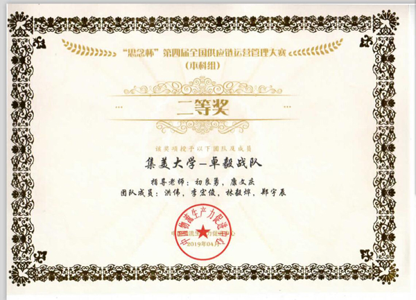 近日,“思念杯”第四届全国供应链运营管理大赛(网赛)落下帷幕。经过激烈角逐,我校卓毅战队(队员:洪伟、李宏俊、林毅烨、郑宇辰,指导教师:初良勇、康文庆),诚毅学院景祺队(队员:郭荣鋆、刘昕、罗建、谢祖铖,指导教师:潘雄)分别获得本科组二等奖。