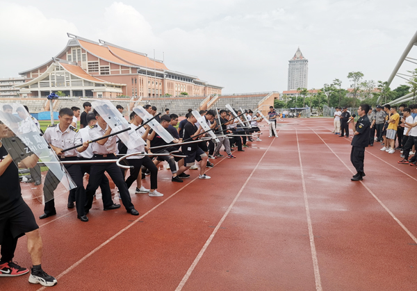 6月26日下午,校保卫处邀请集美区公安分局巡特警大队教官和集美学村派出所警官对各校区90名学生志愿处突队员及丹田物业、厦煌物业等相关人员开展应急处突培训演练活动,以进一步提升校园应对突发性、群体性事件的群防群控能力,增强校园专兼职处突队伍、民警和师生志愿处突队配合协作、联合作战、快速反应的能力,确保关键时刻队伍能够拉得出、防得住、打得赢。培训演练中,集美学村派出所负责人就当前校园安全形势、上级部门对于人员密集区域突发事件防范工作机制、校园安全工作的重要性等方面对全体参训人员进行了宣传教育。集美区公安分局巡特警大队教官详细讲解了防暴钢叉、防暴盾牌、防暴橡胶棍等防暴器械的使用技术要领,以及防暴战斗小组团队作战时的队形要求和战术配合。在巡特警大队教官的指导和队员的配合下,我校师生志愿处突队组成防暴战斗小组进行模拟实战演练,对突发事件的应急处置有了更加直观深刻的认识。
