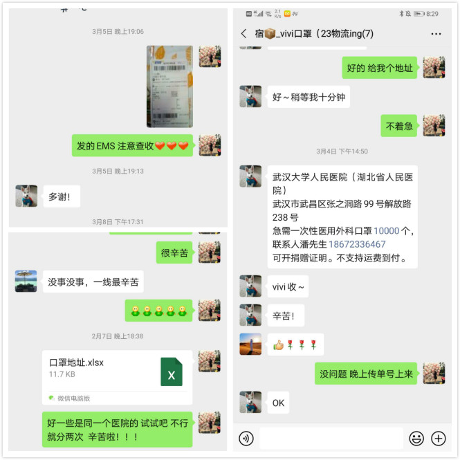“记得有一次我们向医院寄了200个N95口罩,由于数量不多,就没有写捐赠人,但是医院收到以后,特地给顺丰发件人打电话询问捐赠者,说口罩特别好用,很用心,我们听到之后感觉很值得,心里很开心。”能为疫情防控作出自己的贡献,一切都很值得。