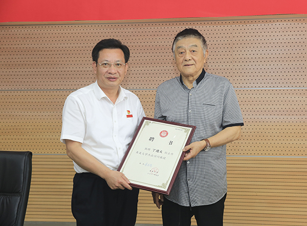仪式上,沈灿煌为丁德文院士颁发聘任证书,佩戴校徽。