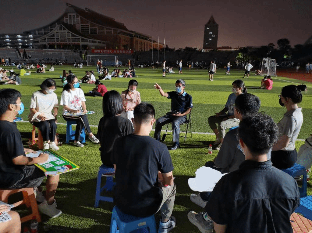 9月28日晚,校长李清彪教授在庄重文夫人体育场,与学校、新校区各学院学生会主席团成员交流座谈。