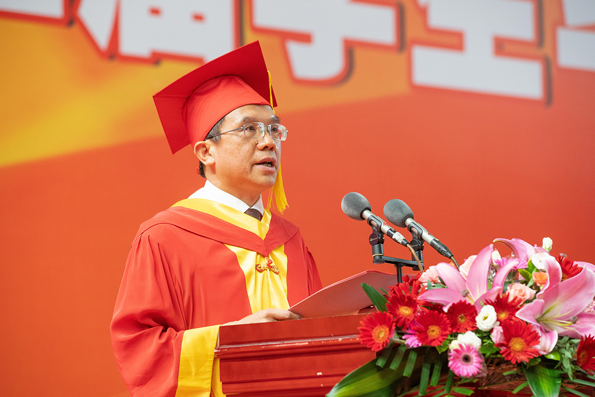 校党委副书记、校长李清彪作题为《穷能守义善其身 达行正道兴天下》的致辞,他希望同学们要独善其身贫守义,穷则思变毅图强,坚守善的底线,乐善好施,以微小平凡的善举义举带动社会向善有义,把善和义的种子播撒到每一个角落;要穷则思变,奋发图强,勇敢剖析自我,开阔视野,丰富心灵,以坚韧不拔、吃苦耐劳的品格做大事、成大器;要达知感恩济社会,贵行正道兴天下,以济世传善,做兼善社会的表率;要笃行正道,达兴天下,以天下为己任,以济世为民的情怀尽力承担更多、更大、更远的社会责任。他还为全体毕业生送上了三字锦囊:第一个是“上”,无论穷达都要保持进取心,向上而行;第二个是“止”,要止于底线、止于良心、止于至善;第三个是“正”,做人要光明正大,仰不愧于天,俯不怍于人,对得起自己,对得起社会。