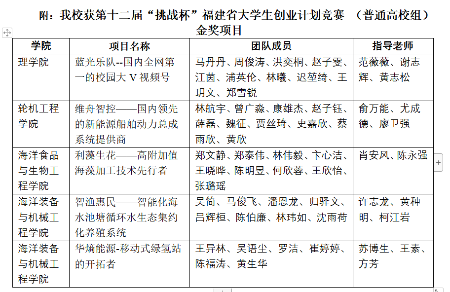 近日,由团省委、省教育厅、省人社厅、省科协、省学联主办的第十二届“挑战杯”福建省大学生创业计划竞赛和第十一届福建省大学生“创业之星”评选活动结果揭晓,我校学子创历史佳绩,获“挑战杯”金奖5项、银奖5项、铜奖4项,“创业之星”标兵、“创业之星”各1项,金奖数在全省普通高校组中位列第一。