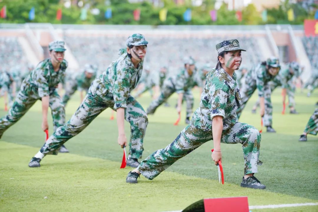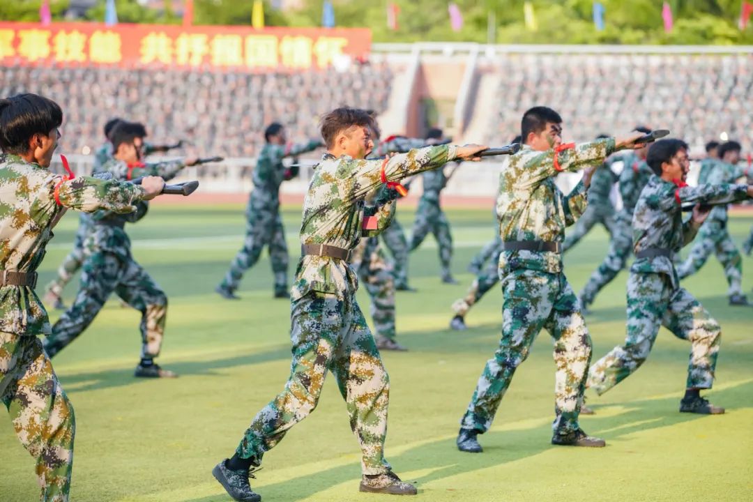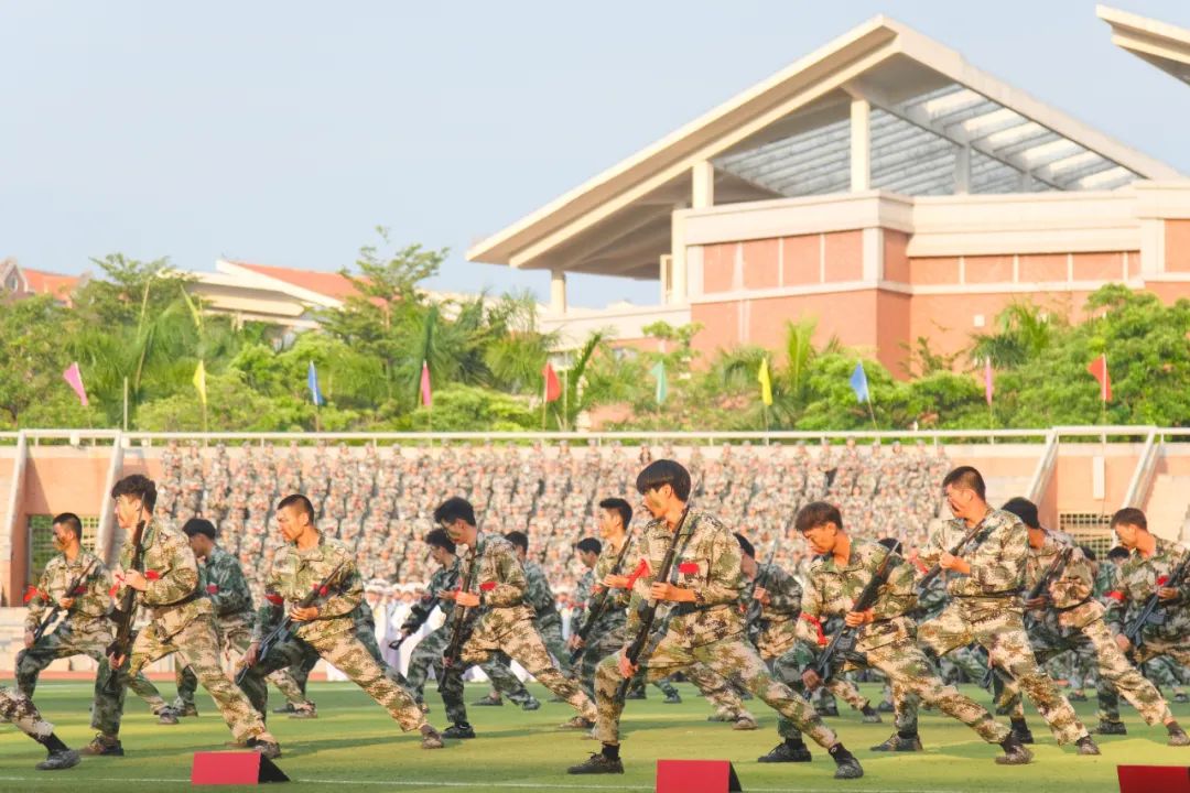 在军事科目展示环节,由体育学院、师范学院、工商管理学院、理学院、海洋文化与法律学院、海外教育学院新生组成的女子匕首操方阵率先登场。她们横刺匕首,击、刺、挑、剪、带,一招一式飒爽利落,真可谓“巾帼不让须眉”。由体育学院、海洋信息工程学院、计算机工程学院、理学院、海外教育学院新生组成的刺杀操方阵也当仁不让,他们手握笔直的枪杆,一突一刺,一防一击,杀声震天,豪情满怀,尽显男儿风采。