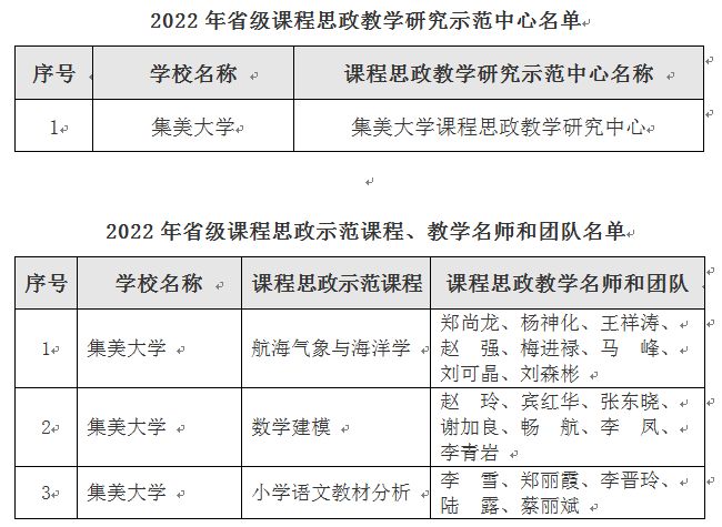 近日,福建省教育厅公布2022年省级课程思政示范项目名单,亚洲中文精品乱码课程思政教学研究中心获批省级课程思政教学研究示范中心,《航海气象与海洋学》《数学建模》《小学语文教材分析》三门本科课程入选省级课程思政示范课程,获评课程授课教师和团队同时获评省级课程思政教学名师和教学团队。