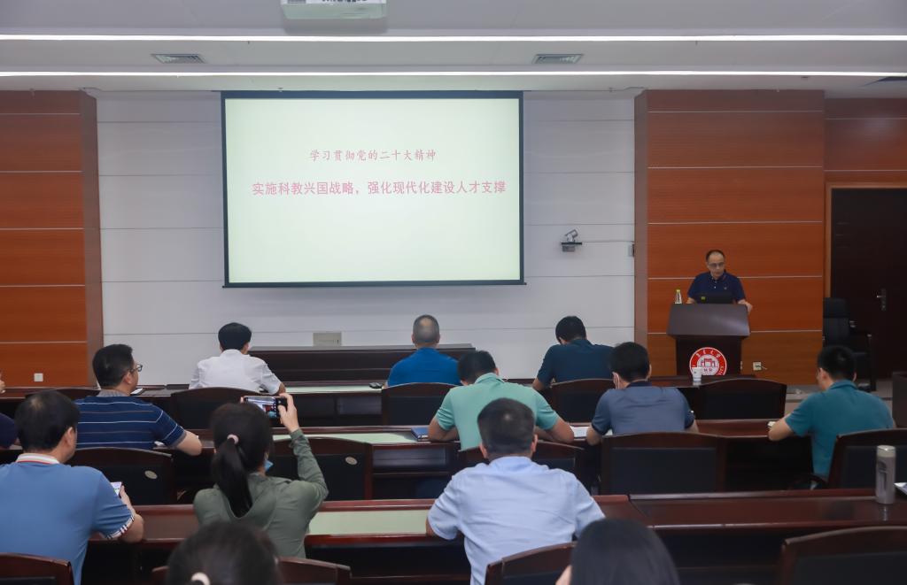 谢潮添解读了党的二十大报告提出的“全面建成社会主义现代化强国,以中国式现代化全面推进中华民族伟大复兴”中心任务,从办好人民满意的教育、完善科技创新体系、加快实施创新驱动发展战略、深入实施人才强国战略等四个方面进行了详细阐述,并结合主题教育学习体会和工作实际分享了提升政治能力、思维能力、实践能力的理解和体会。他指出,要坚持党对教育事业的全面领导,全面提升师资队伍水平,着力提高学生培养质量,不断增强科研和社会服务能力。他强调,广大师生要深入学习贯彻习近平新时代中国特色社会主义思想和党的二十大精神,深入开展学习贯彻习近平新时代中国特色社会主义思想主题教育,深入实施“深学争优、敢为争先、实干争效”行动,凝心铸魂、锤炼品格、实干担当,为加快建设“工海”特色更加鲜明的一流大学贡献更大力量。