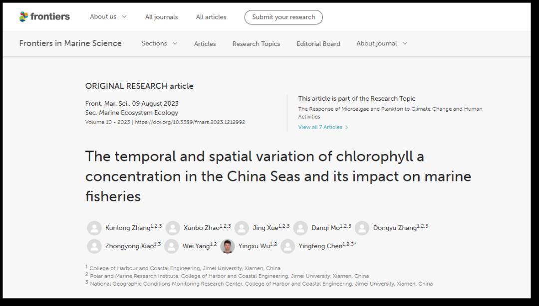 近日,我校港口与海岸工程学院地理信息科学专业2020级本科生张坤龙以第一作者、指导老师陈颖锋为通讯作者,在SCI期刊Frontiers in Marine Science(中科院海洋与淡水生物学1区,JCR Q1,IF=3.7)发表题为“The temporal and spatial variation of chlorophyll a concentration in the China Seas and its impact on marine fisheries”(中国海洋叶绿素a浓度时空变化及其对海洋渔场影响)的研究论文。文章成果有助于深入了解中国海洋生态系统的状态和变化趋势,为国家海洋发展提供科学依据和决策支持。