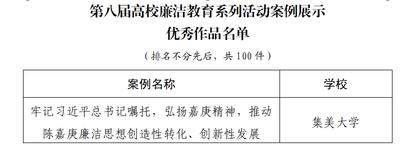 近日,教育部公布第八届高校廉洁教育系列活动结果,我校纪委(监察专员办)撰写的《牢记习近平总书记嘱托,弘扬嘉庚精神,推动陈嘉庚廉洁思想创造性转化、创新性发展》入选案例展示优秀作品。
