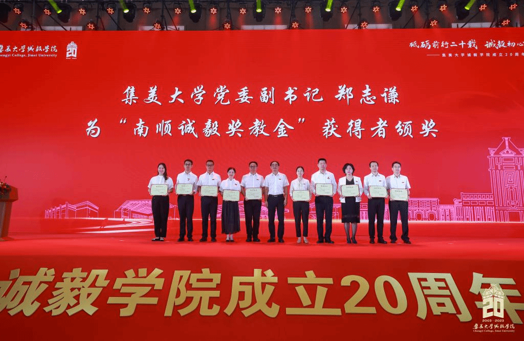 大会举行捐赠授牌仪式和“南顺诚毅奖教金”颁奖仪式,校党委书记沈灿煌为捐赠单位和校友代表授牌并合影留念,校党委副书记郑志谦为奖教金获得者颁奖并合影留念。