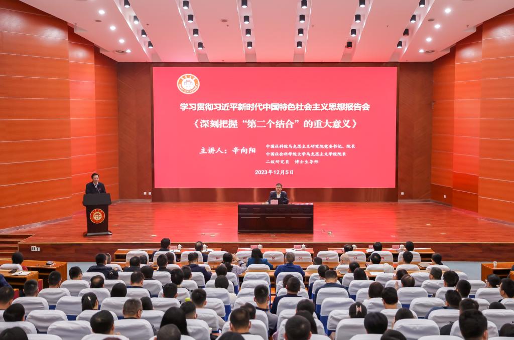 报告会邀请中国社科院马克思主义研究院党委书记、院长辛向阳作专题辅导报告。他以《深刻把握“第二个结合”的重大意义》为题,围绕“第二个结合”的丰富内涵、深刻意义、重要影响等方面,以研究阐释的视角深入浅出地阐释了“第二个结合”对于推动中国特色社会主义事业发展的重要意义。报告解析要深刻把握科学社会主义价值观主张的核心内涵,充分运用中华优秀传统文化的宝贵资源,坚持实事求是,进一步深化对共产党执政规律、社会主义建设规律和人类发展规律的认识。