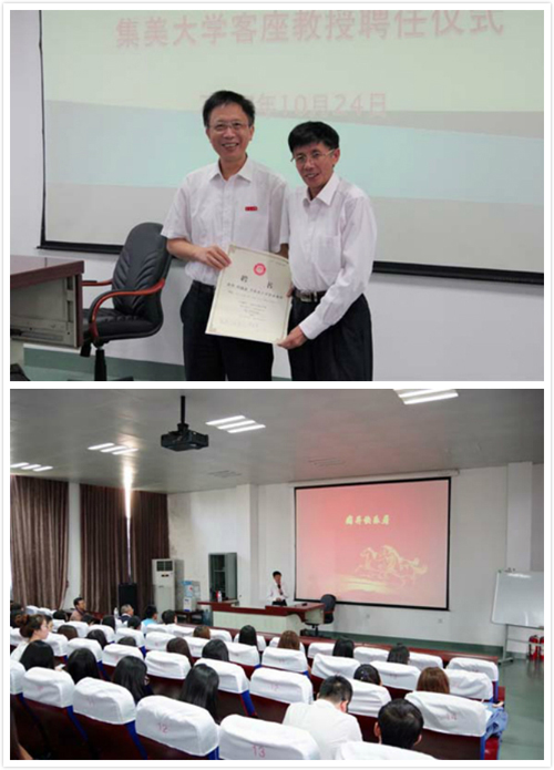 辜芳昭向何福龙颁发了客座教授聘书,学院院长梁新潮对何福龙作了详细介绍。何福龙表示,很荣幸被聘为集大客座教授,将不辱使命,用心做好工作。