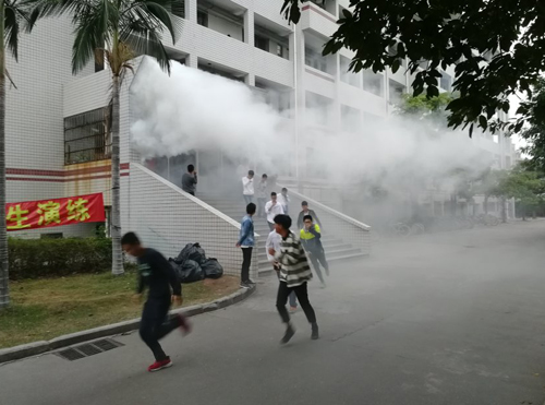 活动现场,通过燃放烟雾弹模拟宿舍区域发生火灾紧急情况,指导学生及时报警,正确寻找、使用灭火器,按照正确姿势逃生。