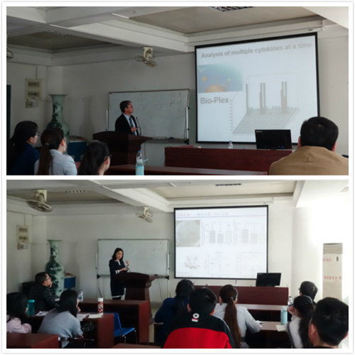 Oda Tatsuya和续旭分别为学院师生作了题为“Biological Activities of Polysaccharides Isolated from Marine Algae”和“褐藻胶及其衍生物的生物活性及构效关系研究”的学术报告。Oda Tatsuya结合他实验室的部分研究成果,系统地介绍了多种海藻多糖、寡糖的制备纯化、生物活性和活性机制,海藻多糖、寡糖在疾病(炎症、癌症)辅助治疗以及水产饵料藻类培养中的应用等。续旭结合她实验室近年来取得的一系列研究新成果,着重介绍了褐藻胶、褐藻胶寡糖及其糖复合物在抗炎和干预阿尔茨海默病方面的潜在作用机制。