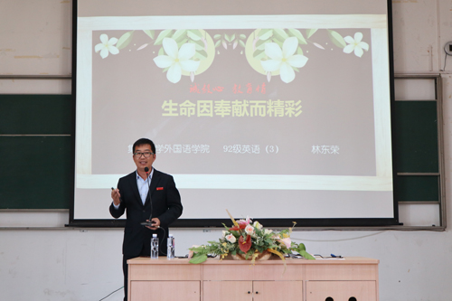 3月21日下午,我校迎校庆百名校友报告会(第六场)在外国语学院举行,我校92级英语专业校友、全国第二届十大“最美家乡人”、厦门市新圩学校(厦门五缘实验学校翔安分校)校长林东荣应邀做关于“爱与奉献”的主题报告。