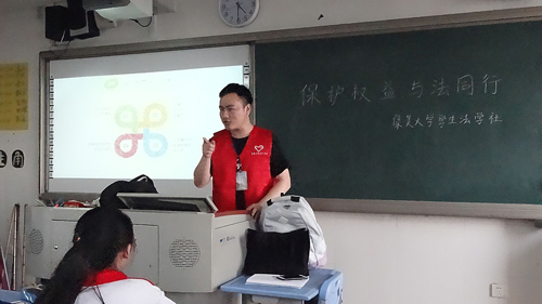 校法学社志愿者们,围绕青少年维权、校园暴力、交通安全、食品安全等青少年生活中常见的法律维权问题,以普法宣讲为主,辅之以PPT讲解、法条分析、案例分析、视频播放以及有奖问答等环节,全方位、多层次、多途径培养中学生们的维权意识和法律观念。