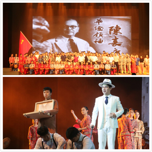 《华侨旗帜》以现实主义话剧为基础,以陈嘉庚的生平事迹为背景,分南洋风云、嘉庚办学、陈嘉庚在重庆、陈嘉庚在延安四幕,将历史回顾、道德教育与文化反思溶于其中,展现校主陈嘉庚的伟大抱负和爱国情怀。学院参演学生张弛有力的表演,与朗诵、舞蹈、灯光融为一体,精彩演绎了陈嘉庚寻求教育兴国之路的办学经历、造访重庆的失望之旅及与共产党领袖推心置腹的延安之行,受到了一致好评。
