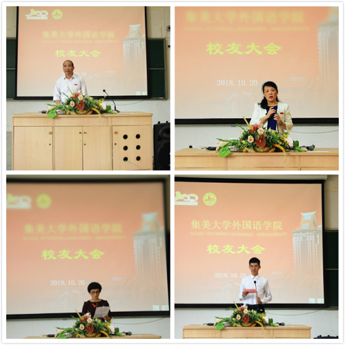 会上,外国语学院党委书记杨龙美介绍了学院领导及几位优秀校友。学院院长黄锐致辞,介绍了学院的历史渊源和目前的发展情况,对校友们百年校庆之际的爱心捐赠表示衷心的感谢。学院党委副书记陈雅珍宣读了《外语校友基金章程》。