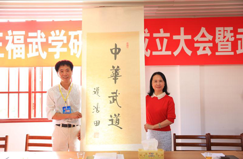 在我校百年校庆之际,体育学院79级校友、厦门飞龙特卫信息咨询有限公司董事长杨升,为表达对母校百年校庆的祝贺,向体育学院捐赠自己珍藏多年的中央军委原副主席、原国务委员兼国防部长迟浩田上将所书的“中华武道”的书法长轴。