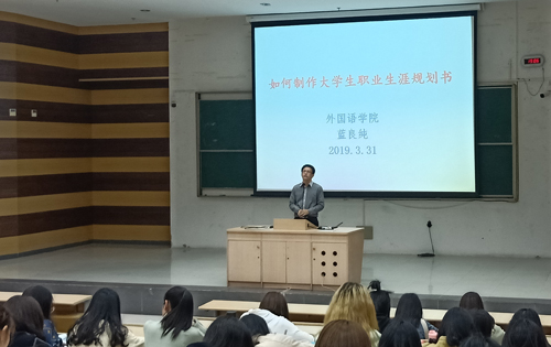 近日,外国语学院举办了“职业生涯规划书”讲座,学院团委书记蓝良纯担任主讲。学院2018级全体学生聆听了讲座。