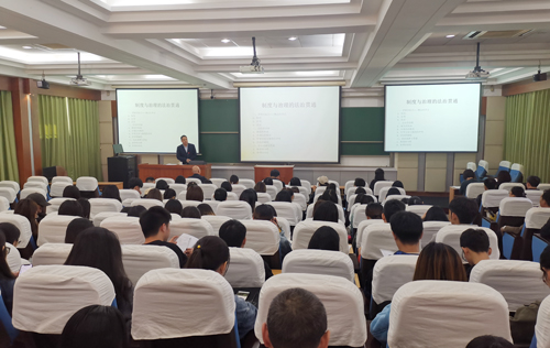 报告中,吴贵森从制度、治理、法制的概念界定入手,详细阐述了在中国法治路径探索的过程中,实现技术进步以解决价值问题的重要性,以及规则偏离和法治缺陷语境中重寻共情的必要性;并结合现实案例,生动讲述了治理法治化过程中制度规范与情理的博弈过程,阐释了中国特色社会主义制度和国家治理体系的实践成果。报告内容详实、解析生动,学院师生深受启迪。