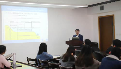 讲座中,施余兵从当前国际立法体系出发,从“为什么规制”“什么方式规制”以及“为什么国际立法”等角度引导学院师生思考国家管辖范围以外区域海洋生物多样性的规制问题;结合自己参加BBNJ国际协定立法的经历,详细介绍了BBNJ国际协定的起草背景、谈判历程以及当前的缔约进展,阐述和分析了截止目前谈判每个阶段各缔约国的关注重点、所持观点及谈判成果;阐述了基本立场、一般要素、海洋遗传资源、划区管理工具、环境影响评价、能力建设和海洋技术转让、跨领域问题等法律议题;重点讲述了“人类共同继承财产原则”与“公海自由原则”的两大原则之争,强调了海洋遗传资源的重要性,并重申了“共商、共建、共享”的中国态度。