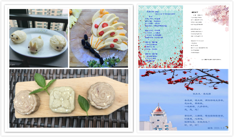 3月8日,法学院、马克思主义学院女教工积极响应学院活动号召,分享了居家防疫期间自己的文化战役作品、健身战役视频以及厨艺成果。其中,马克思主义学院魏联分享了她为疫情加油鼓劲的歌词《爱的火焰》《热血》以及诗歌《樱花树下》;法学院程国琴分享了自己创作的诗歌《钗头凤·春光媚》,展示了自己的厨艺秀;马克思主义学院黄萍华分享了运动战役健身操;其他女教工也纷纷秀出自己居家厨艺作品。