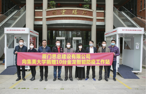 新冠肺炎疫情发生以来,厦门思总建设有限公司持续关注学校疫情防控,关爱师生身心健康。在得知学校防疫物资紧张的情况下,积极增援并捐赠600瓶500ml免洗抑菌凝露(A版)。此次捐赠的金龙智能防疫工作站是出入口防疫监控综合管理平台,由智能检测区和360度消毒区两大区域组成,全流程非接触智能操作,体温检测、口罩佩戴侦测、消毒及智能考勤智能互联一站式搞定,降低了学校安保工作人员的劳动强度及人员交叉感染的风险。