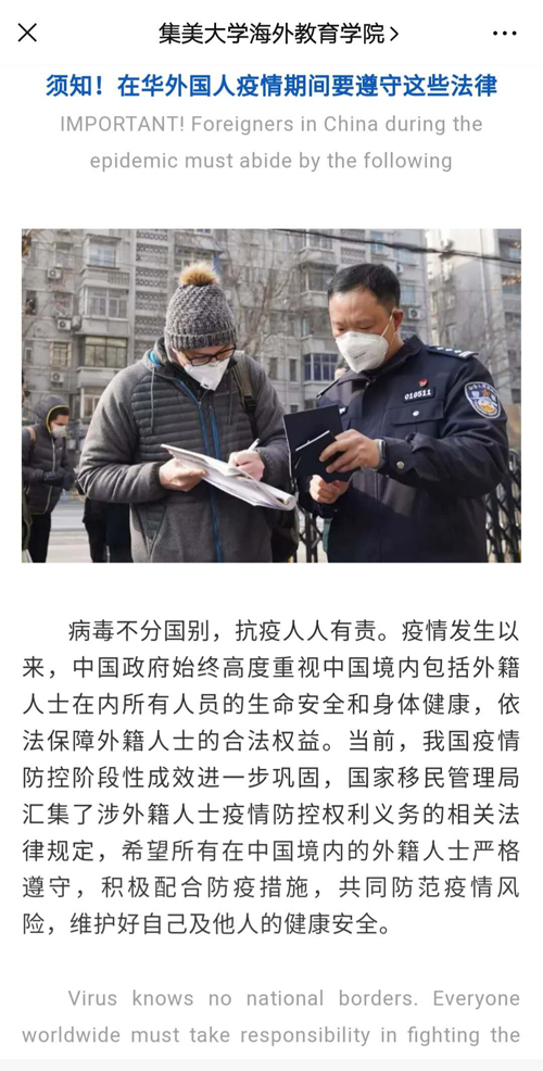 疫情期间,学院积极落实国际学生普法教育工作,通过学院微信公众号转发国家移民管理局关于外籍人士疫情防控权利义务的相关法律规定,内容涉及疫情防控中的基本法律知识、出入境管理、卫生检疫、社会秩序维护和治安管理等常见的法律问题,使国际学生进一步了解和掌握疫情期间哪些举动将触犯疫情防控过程中国家出台的法律法规。