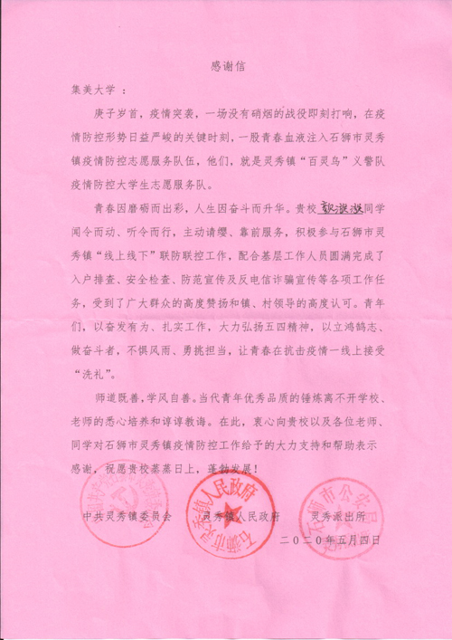 信中对学院学生在石狮市灵秀镇疫情防控工作给予的大力支持和帮助表示肯定和感谢,并致以学校、学院诚挚的祝福。