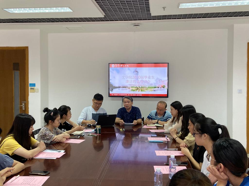 6月12日,文学院开展2020届毕业生廉洁教育专题座谈暨毕业教育大会,学院党委副书记华晓春、党委组织员、团委副书记、毕业班辅导员和2020届毕业生代表线下参加活动,其他毕业生在线上参加。