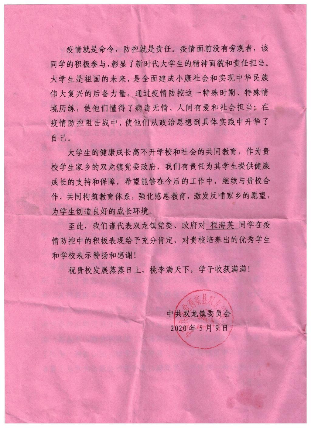 在疫情防控期间,程海英同学积极参与疫情卡点执勤、疫情防控宣传、辅导中小学生网课学习等工作,受到学生家长的一致好评。信中对程海英同学在疫情防控中的积极表现给予充分肯定,并对学校、学院的发展表达诚挚的祝福。