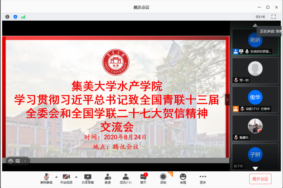 8月24日下午,水产学院团委在线上举行学习贯彻习近平总书记致全国青联十三届全委会和全国学联二十七大贺信精神交流会,以凝聚全院青年力量,促进学院团学工作改革创新,动员和组织广大青年在建设“双一流”大学道路上坚定跟党走,建功新时代。学院党委副书记、青年教师代表、团委书记、辅导员、研究生会、学生会、习近平新时代中国特色社会主义思想学习社干部代表参加了会议交流。