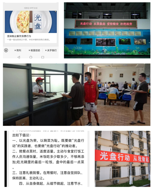 学院团委通过微信公众号向全院学生发出“厉行节约,反对浪费”倡议书;全院各团支部以倡议接龙方式开展主题团日活动;院自律会组织青年志愿者在第九餐厅开展体温检测、光盘劝导、文明就餐、餐盘回收等督导行动;此外,在食堂门口、综合楼大厅等学生出入集中的地方张挂“爱惜粮食杜绝浪费”“光盘行动从我做起”等宣传标语,进一步营造“厉行节约,反对浪费”的校园氛围。通过近段的宣传教育,师生的节粮意识有所提高,就餐点菜更加适度适量,浪费可耻,节约为荣的氛围逐渐形成。
