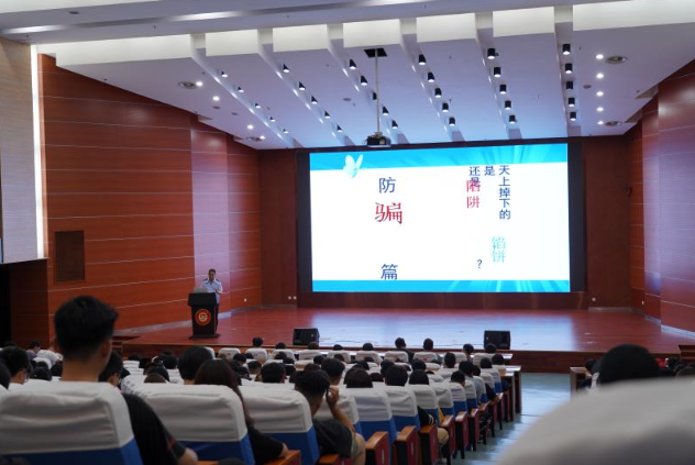 讲座中,朱警官首先结合新生最容易中招的诈骗方式,向同学们说明了校园诈骗的主要类型,以一系列大学校园中真实的案例强调了诈骗对校园安全和学生财产安全的严重危害性,分析了导致学生被骗的各种心理原因,并给出相应的对策及建议。他指出,防诈骗必须做到不轻信、不透露、不转账,遇到可疑的情况要及时报警。同时,他还为同学们开展了交通安全、消防安全、禁止毒品、文明上网、不打架、不传谣等方面的安全法制知识教育。
