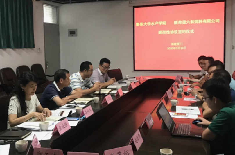 近日,水产学院与新希望六和股份有限公司举行产学研合作、奖学金捐赠协议签约仪式。新希望六和股份有限公司饲料BU水产料线路运营负责人宋元方、饲料研究院特水料技术负责人刘匆、新希望六和广东新区人资负责人黄继胜、新希望六和饲料研究院人资负责人韩健和水产学院全体院领导出席了签约仪式。