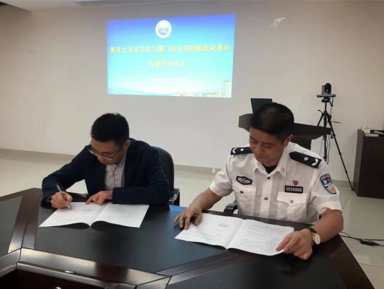 在仪式会上,黄煜感谢厦门司法强制隔离戒毒所对法学院人才培养和科研工作的支持,希望双方通过共建进一步优势互补,实现资源共享,共同为推进厦门禁毒工作的创新和发展而努力。汪志远表示双方之间有着合作交流的天然地缘优势和良好基础,未来将继续探索和拓展新的共建途径和形式,推动禁毒工作进一步发展。随后,双方代表签署了共建协议书。