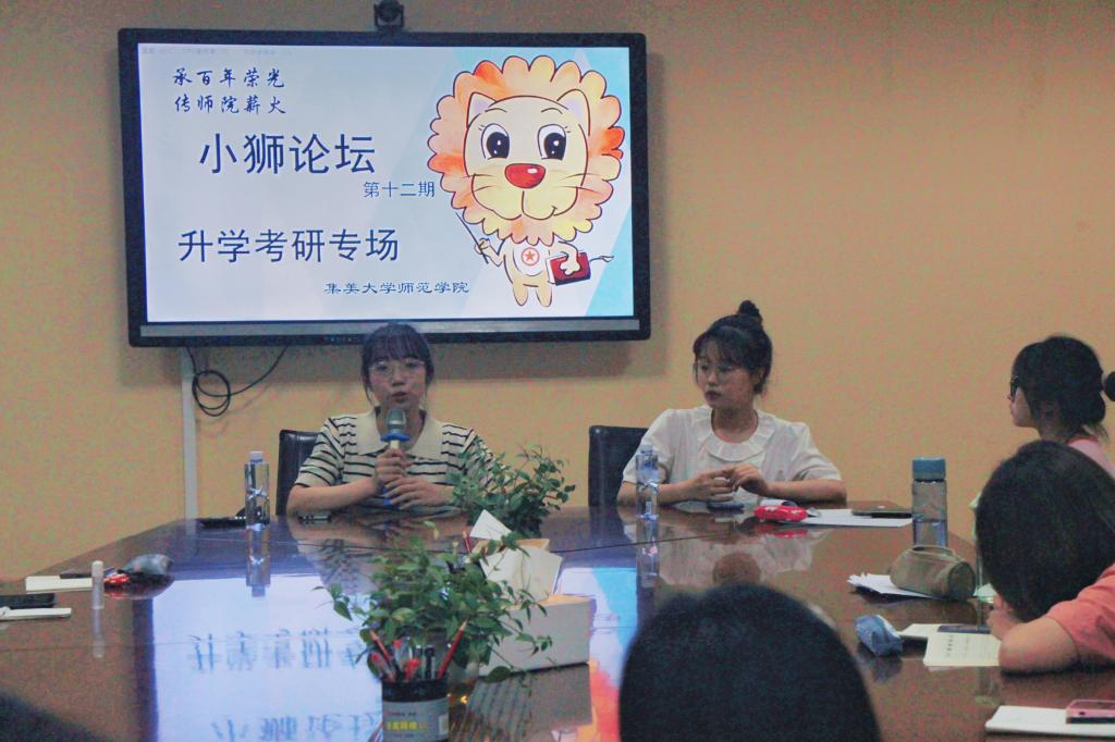 近日,师范学院于吕振万205会议室举办“承百年荣光,传师院薪火”小狮论坛活动,论坛围绕升学主题分为保研分享会和考研分享会两个专场,学前1711廖婧琳、小教1712班陈铭塬、学前姚冰应邀主讲。