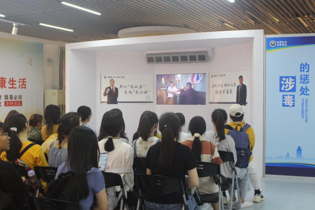 6月8日下午,师范学院全体学生党员在志愿者的带领下参观了禁毒教室,观看了我校学生自主制作的禁毒宣传片。