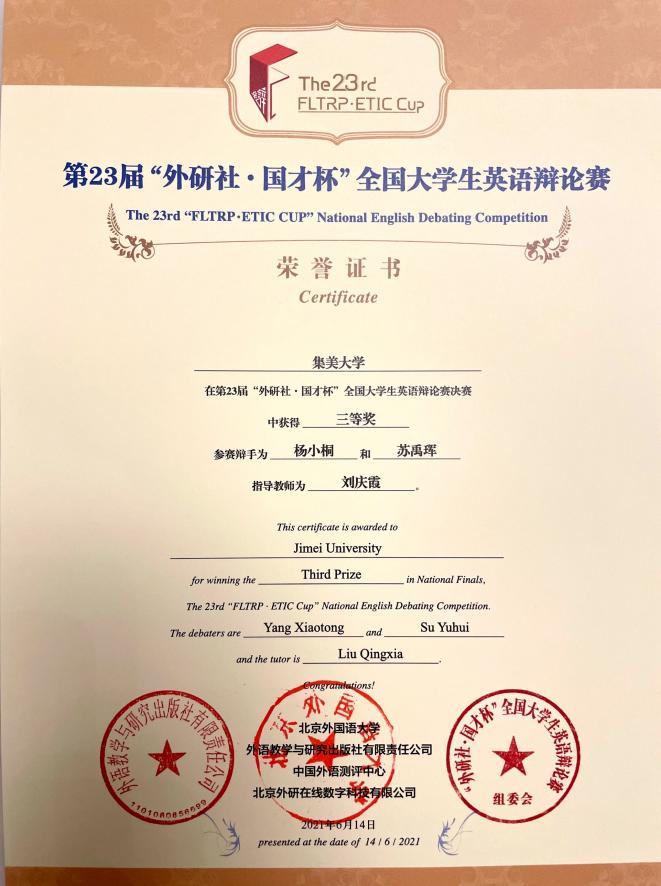 近日,第二十三届“外研社·国才杯”全国大学生英语辩论赛落下帷幕,来自全国各地的128支队伍同台竞技,我校外国语学院翻译1912班的杨小桐、苏禹珲两位同学在刘庆霞老师的悉心指导下荣获全国总决赛三等奖。