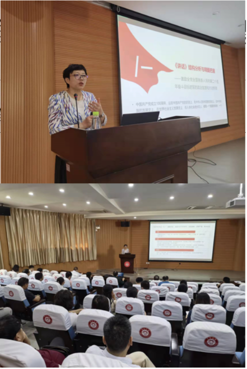 李晋玲按总论、分论、结论三个层次,对习近平总书记“七一”重要讲话精神进行分析归纳;运用生动的图片、视频材料,结合丰富的党史事例,对“四个伟大成就”“四个庄严宣告”“九个必须”“中国共产党人的精神谱系”等讲话要点深入阐述,帮助在场师生进一步领悟理解“中国共产党为什么能”“马克思主义为什么行”“中国特色社会主义为什么好”, 以及如何把建党精神融入到学习、工作、生活中,积极进取,同甘共苦,为实现中华民族伟大复兴努力奋斗。